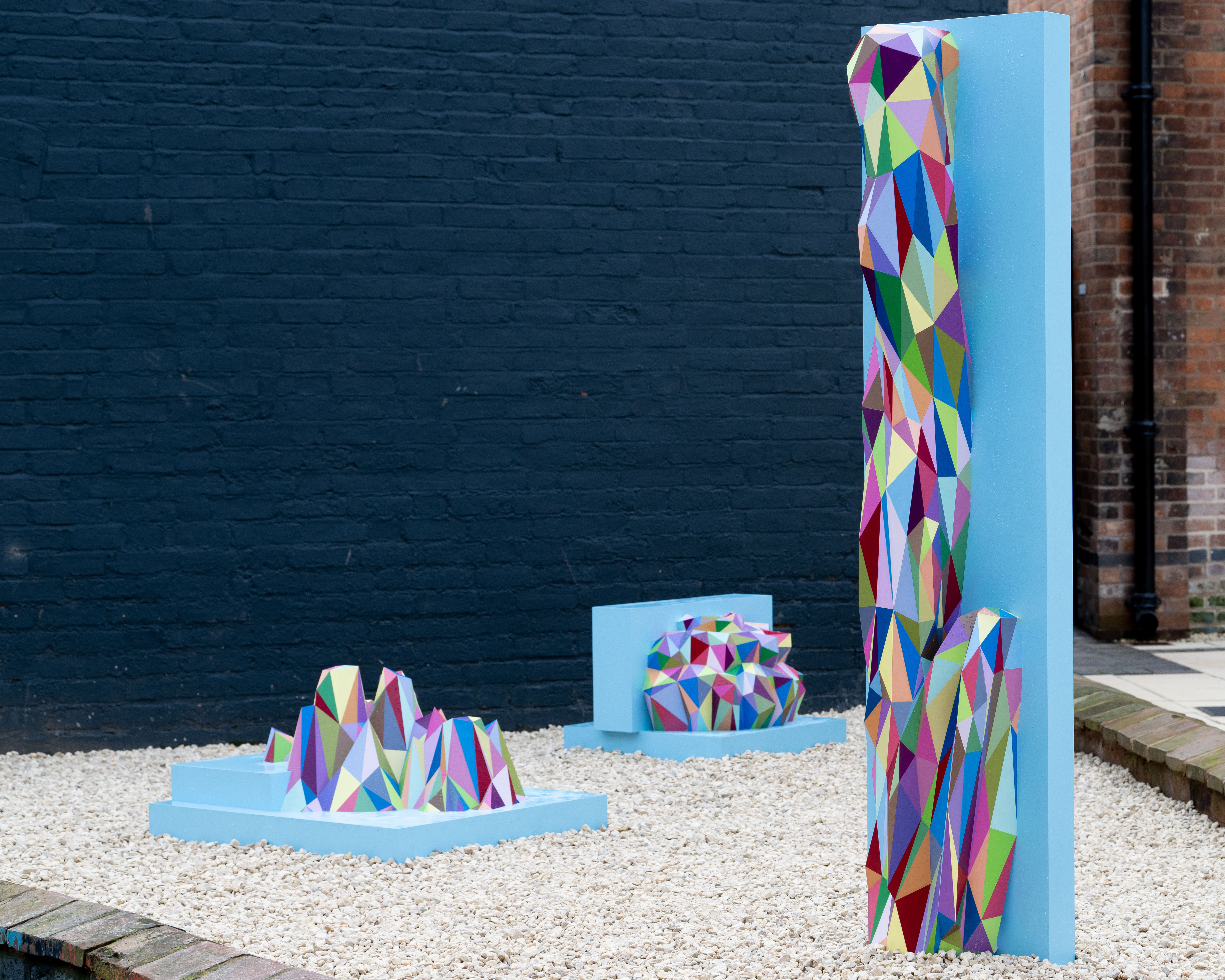 As if dropped from a digital or virtual world, the sculptures instigate a moment of surprise, consideration and reflection. The source material is ‘off-the-shelf’ digital assets created in Game Engines using Nanite-enabled meshes. Nanite Triangle Visualization is a high specification digital rendering tool that allows images to hold their detail in fast paced games or movies. Nanite Virtualized Geometry by Unreal Engine, and other proprietary processing systems, are changing the face of digital content possibilities.